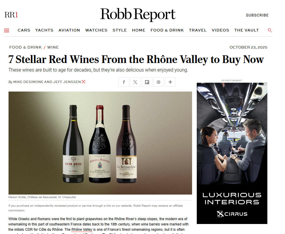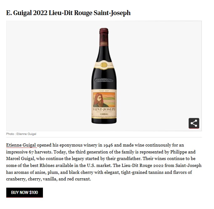Robb Report recently assembled a short list of the best reds from the Rhône Valley to add to your cellar right now, pointing out that these bold, often Syrah-based beauties are complex, earthy, brooding and deeply age-worthy. E. Guigal, they note, makes “some of the best Rhônes available in the U.S. market” and specifically include the E. Guigal 2022 Lieu-Dit Rouge Saint-Joseph, praising it for its elegant aromas of “anise, plum and black cherry.”