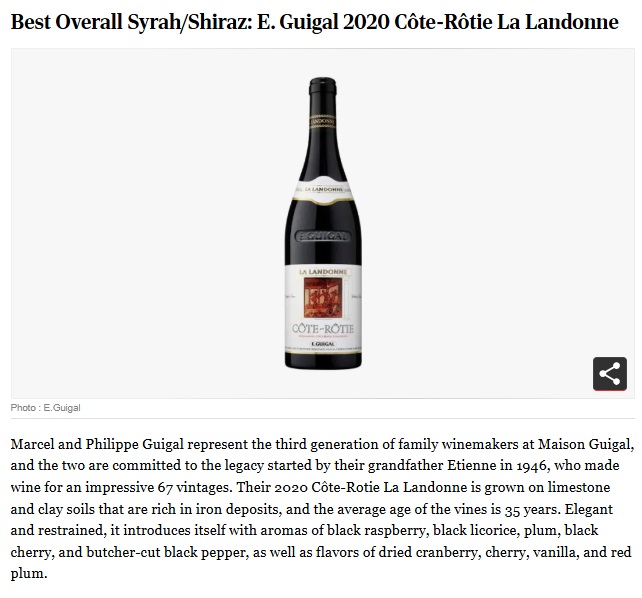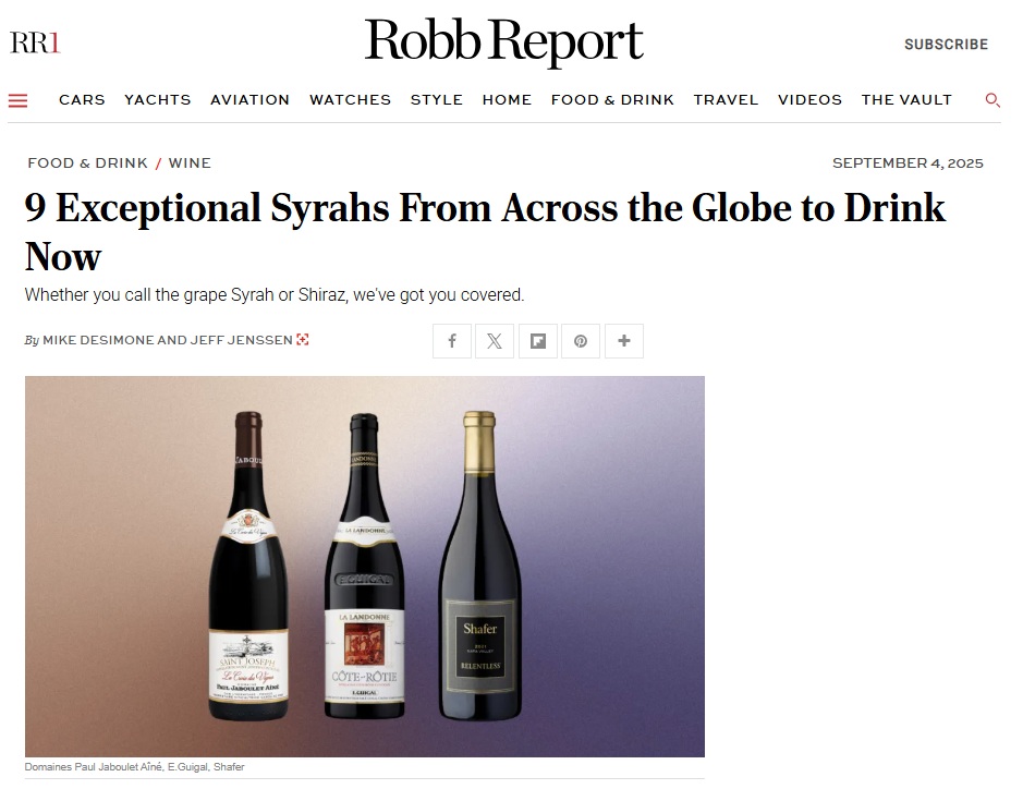 In the September 4, 2025 article “9 Exceptional Syrahs From Across the Globe to Drink Now,” Robb Report names E. Guigal’s 2020 Côte-Rôtie “La Landonne” as the “best overall” syrah globally.