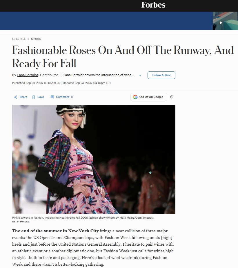 On the heels of New York’s September fashion week, Forbes contributor Lana Bartolot explores the intersection of fashion week and elegant rosé, and makes the case for sipping our favorites well into autumn. Specifically, she highlights the Roseblood Rosé from Château d’Estoublon — an “energetic blend” of Grenache Noir, Syrah and Vermentino.