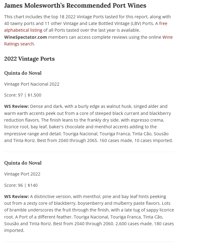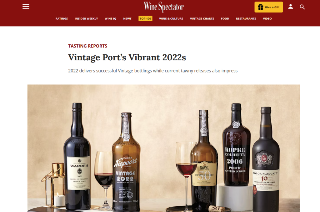 In a comprehensive 2022 Vintage Port report by James Molesworth, Wine Spectator highlights Quinta do Noval’s outstanding performance among the releases, naming their Vintage Port Nacional 2022 (97 points) as one of six to earn a classic rating of 95+ points. Their sister bottling, the Quinta do Noval Vintage Port 2022, also made the cut at 96 points.