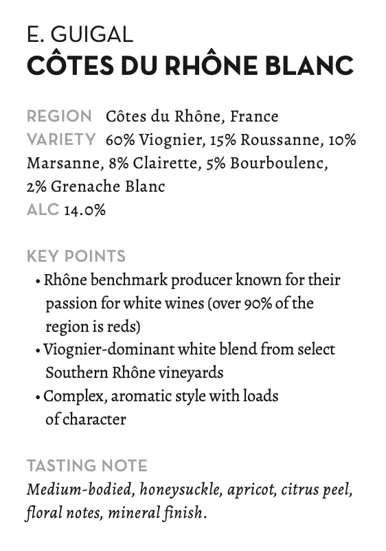 While most Côtes du Rhône Blancs are based on Grenache Blanc from the south, the Guigals flip the script and base this wine on Viognier. Since 1991, they have searched for and worked with growers to encourage new plantings for this wine. A variety that nearly died out in the mid-20th century, they believe it adds critical freshness and aromatics to this wine.