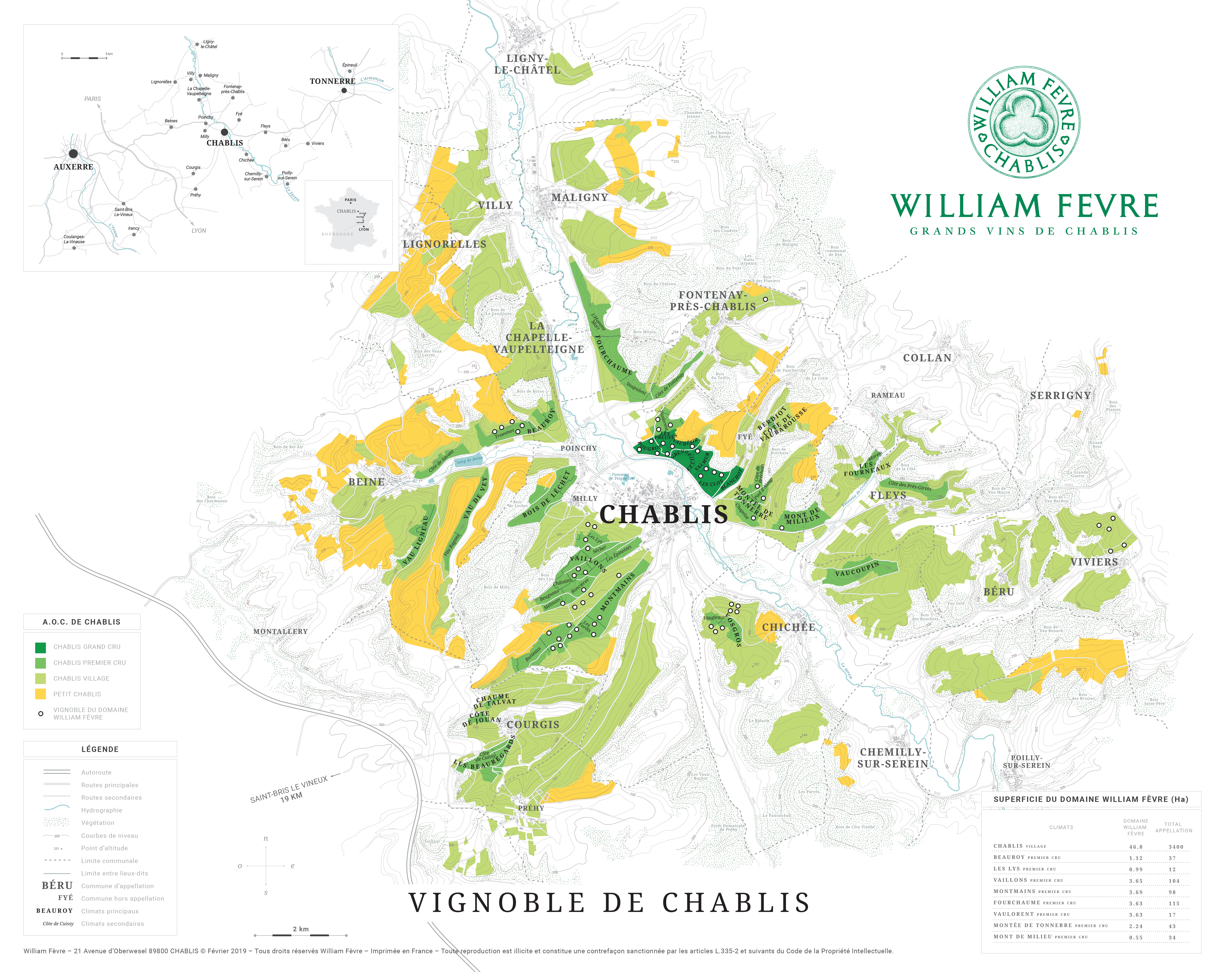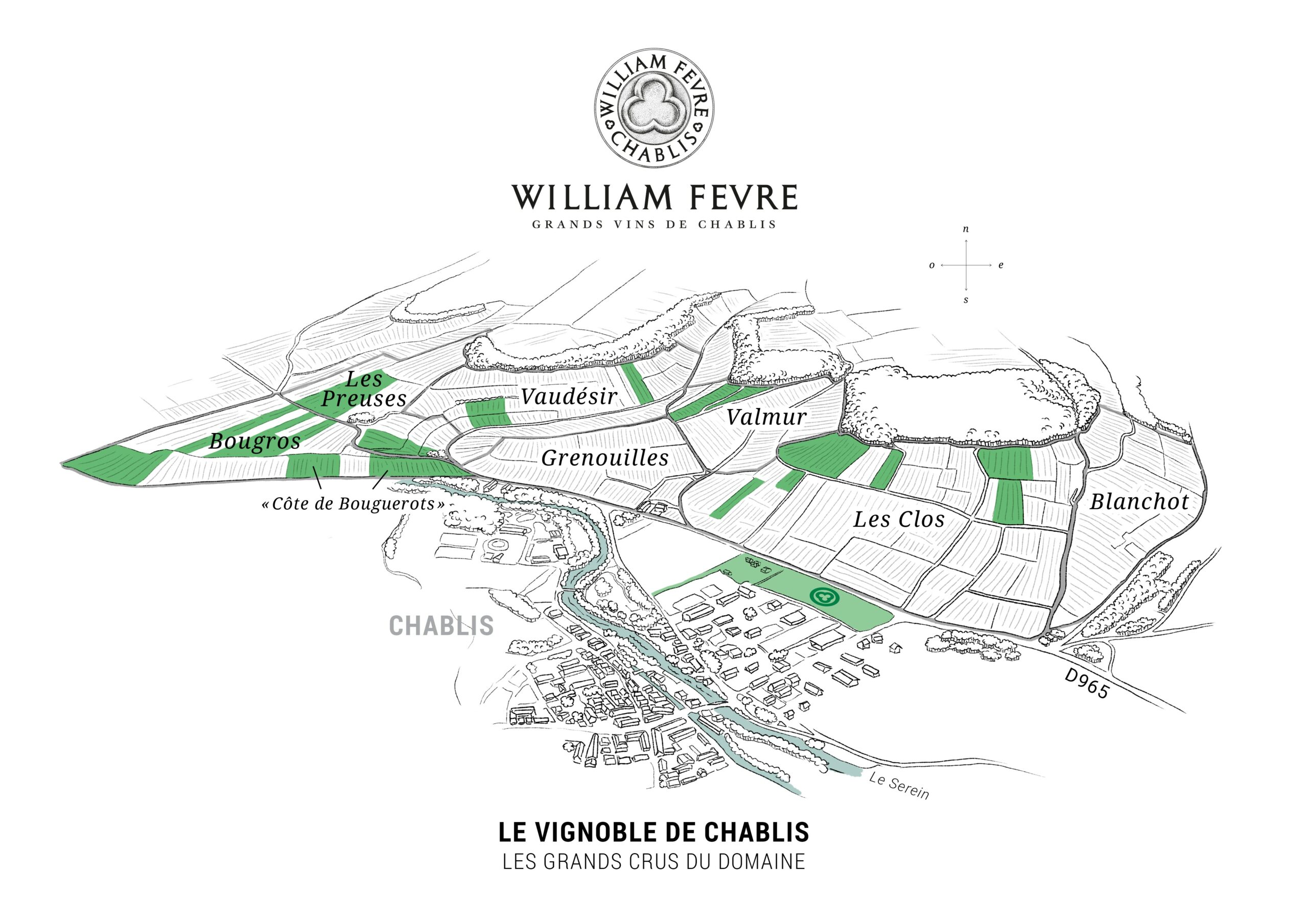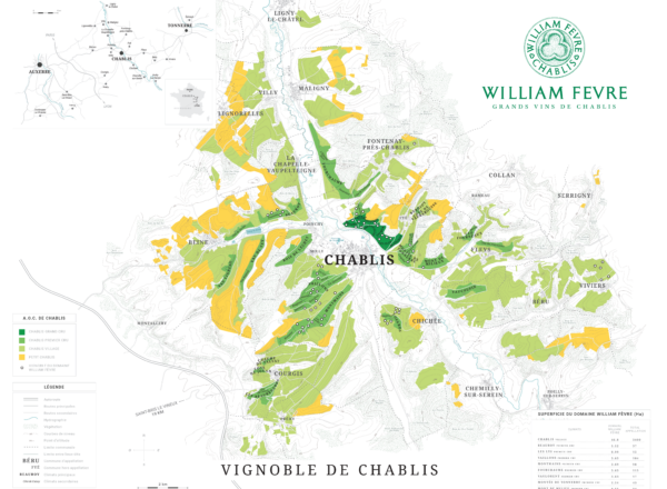 This left-bank cru spans a massive 104 hectares divided into 8 climats – Fèvre owns 3.65 hectares over 12 plots. One of the first vineyards to reach maturity, it shows its fast ripening in shades of peach, pineapple, and pear.
